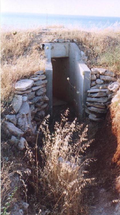 They were on top of a steep hill, the first with a single embrasure overlooking the bay. This was connected by a slit trench to an open gun pit, which was in turn connected to another pillbox. This had a single embrasure overlooking the far left side of the bay. I found an identification plate but am not sure when they were built.