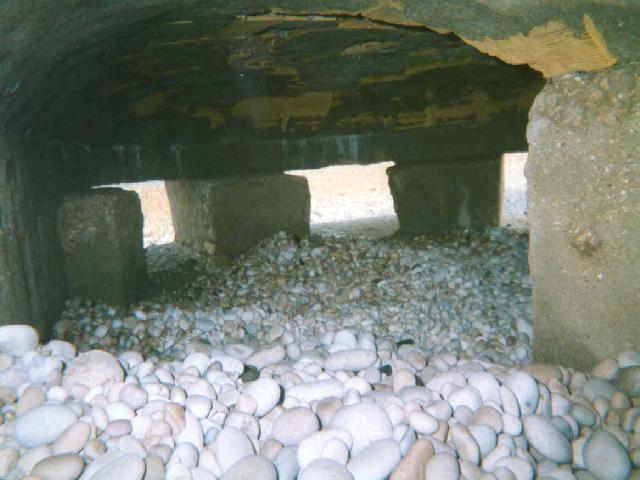 Large stones have been set in the top and it has the same hugely thick walls. On the two intact ones some lateral iron rods can be seen where weathering has occurred around the embrasures but if this one is typical then the need for the thickness is explained: it isn’t built from ferro-concrete but from cement with pebbles mixed in and here and there the hopeless bricks (which can be seen in the roof of the interior pictured).