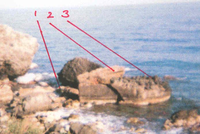 The three main sections of the middle structure. Smaller pieces litter the area. Part 3 is the roof, with camouflaging rocks inset, which make handy toe and hand holds if exploring when waves are breaking against it. However, speaking from experience, suggest taking care and decent footwear as the safer looking rocks on the shore may not be as secure as they look
