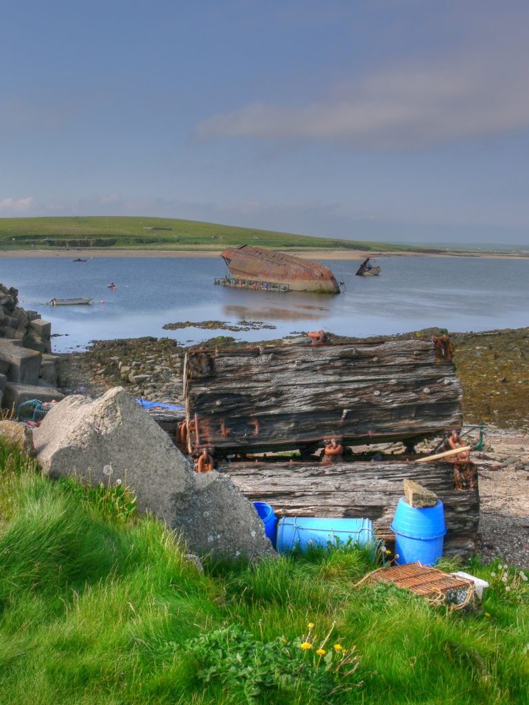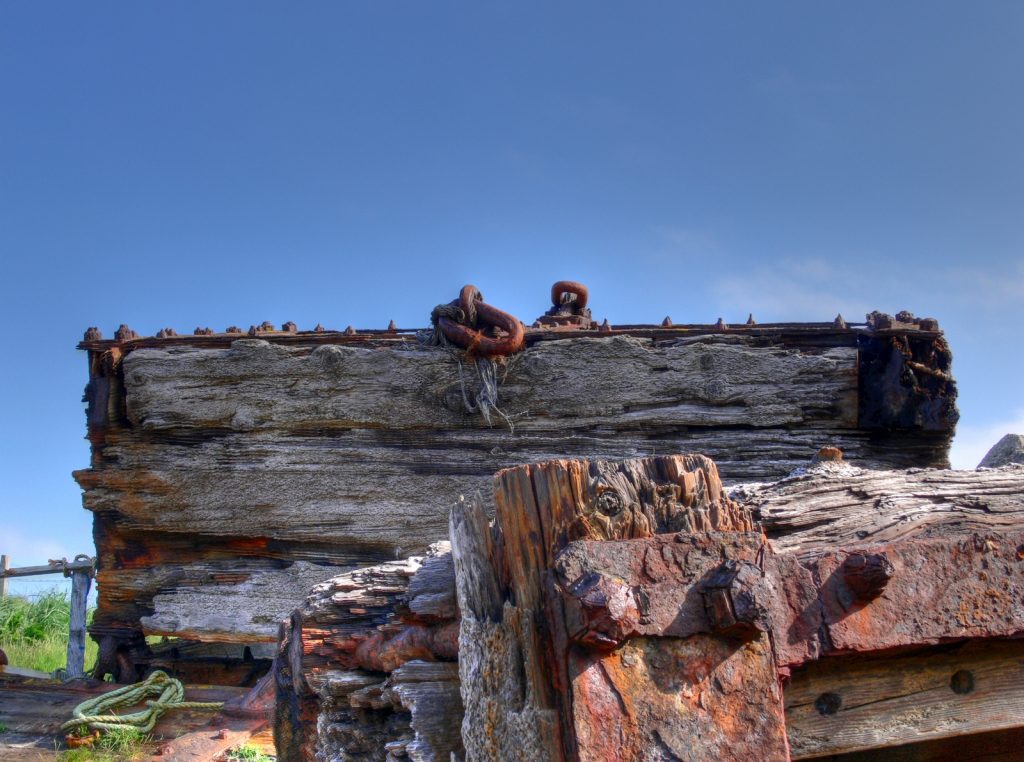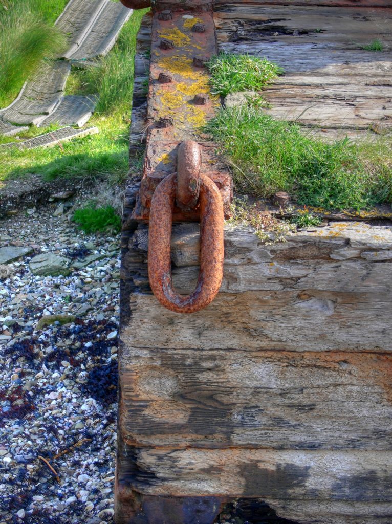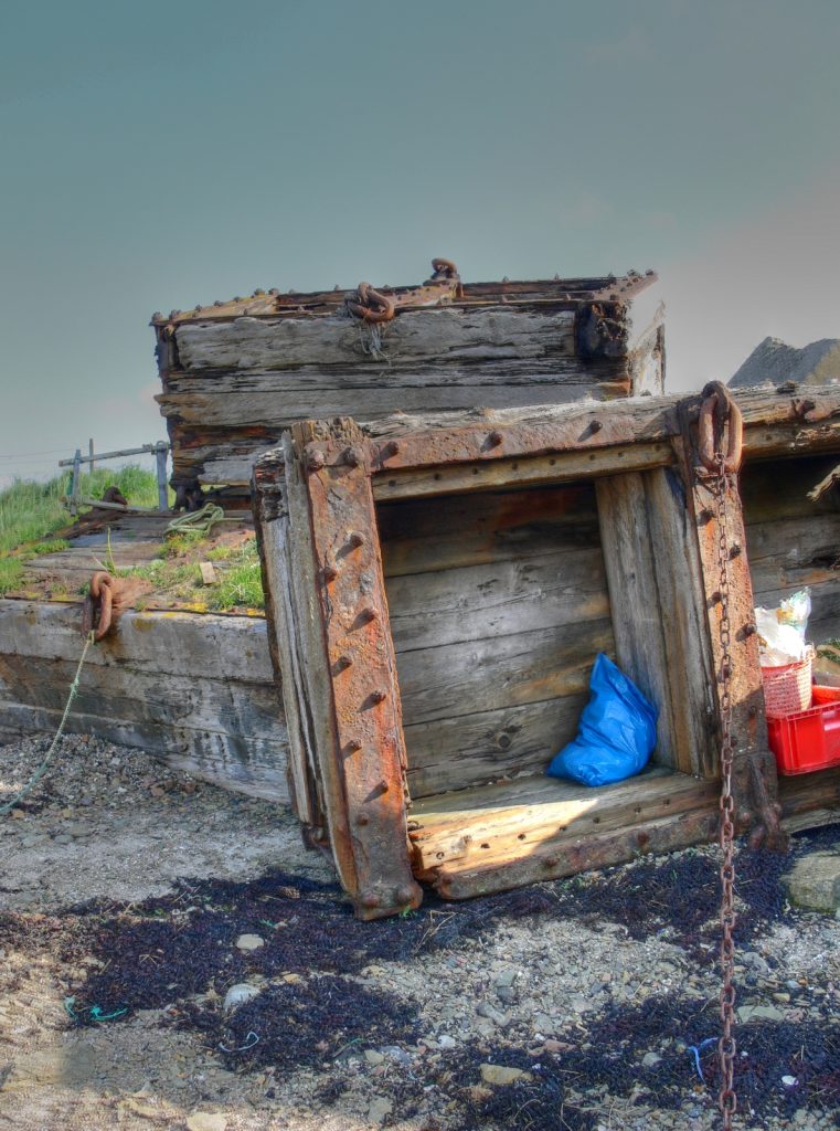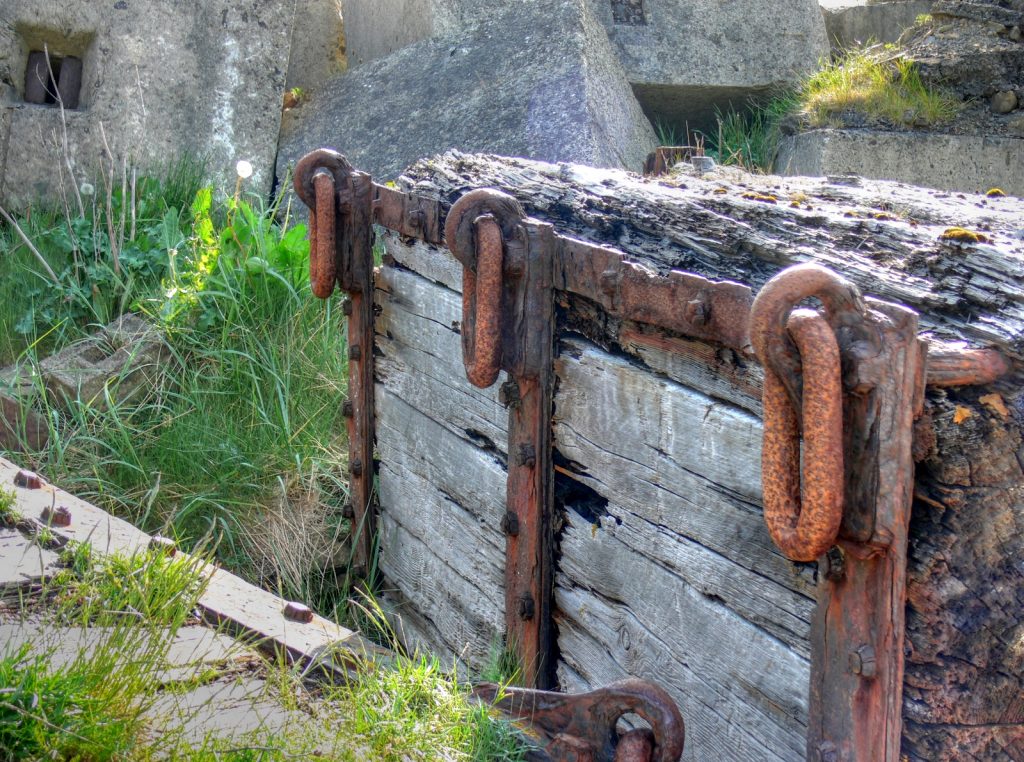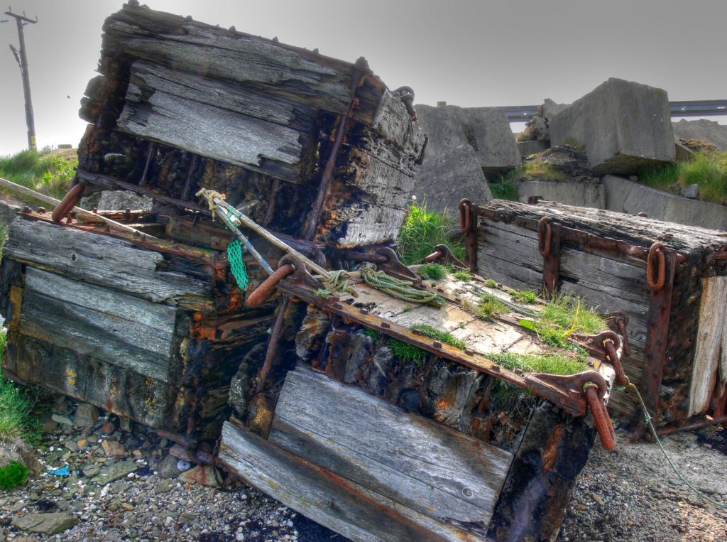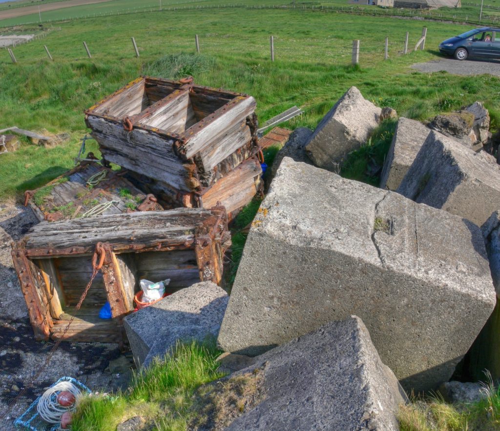 As shown in the sketch the standard baulk is a heavy iron-strapped wood and metal tank fitted with eye bolts and links for connecting the boom jack-stays, two pairs on top and one pair across the center line of the bottom. Two watertight iron tanks occupy the interior of each baulk to provide flotation. The steel tanks proved popular with Orkney farmers and can often be found in fields used as cattle troughs.
