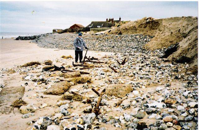 The beach scaffolding has been exposed by recent high tides and the section of exposed angled wall I think may well be an anti-tank wall?