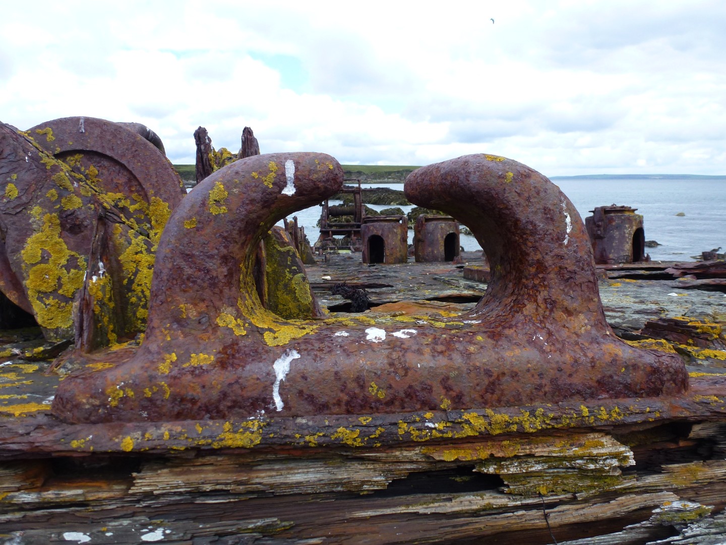 One of the two 12pdr temporary mountings for Scad battery – there’s no sign of the other. Pictures and video June 2025. Light (for Orkney) rain falling.
