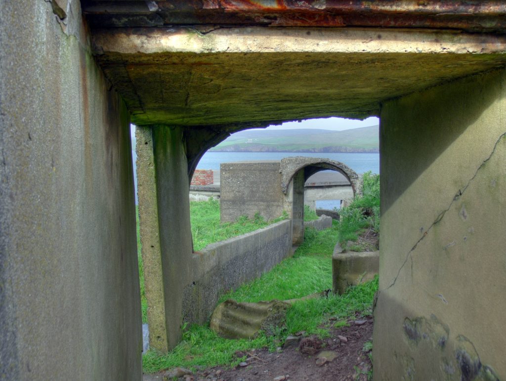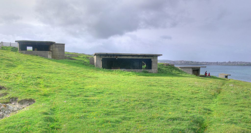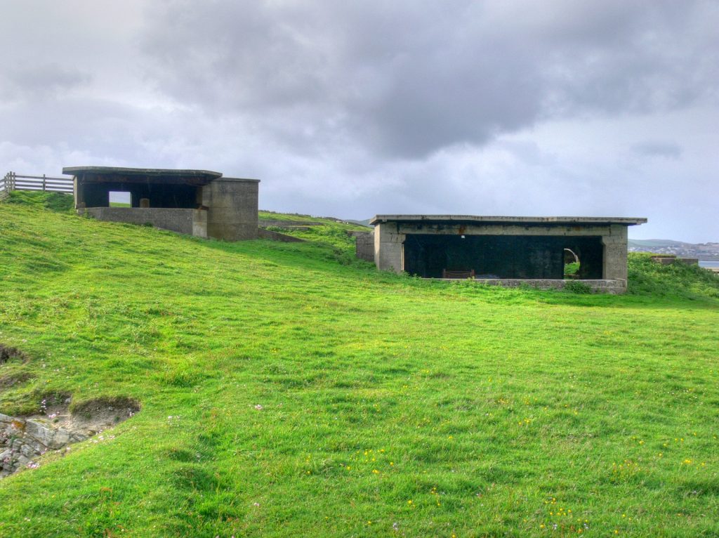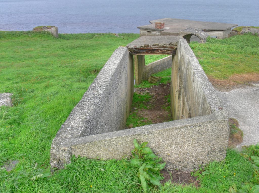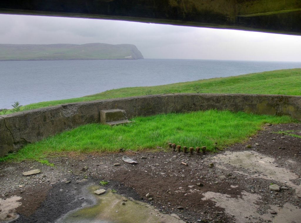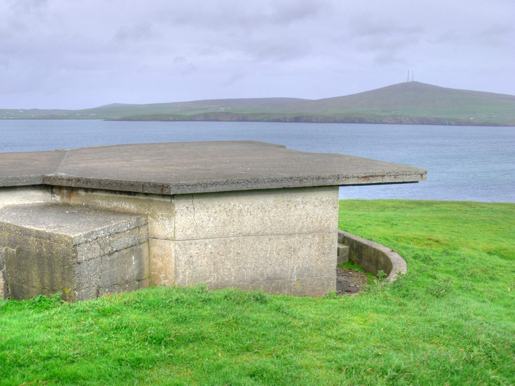Coastal Battery. The surviving remains of this battery consist of two gun emplacements, magazine, engine room, battery observation post and three searchlight emplacements. In June 1940 two 4-inch guns were emplaced, being replaced in July 1940 by two 6 inch guns. The two 4-inch guns were moved to Calback battery at Sullom Voe (Scottish NMR HU37NE 10). Shetland Islands Council have now purchased the site.