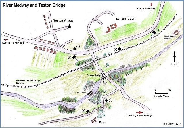 All the pillboxes are built to shellproof standards and the defences consisted of two Type 28A and two type 24s on the north side of the River Medway, to the south of the river are two shellproof rectangular pillboxes. The sketch map shows the positions of the defences in relation to the river and the village.
