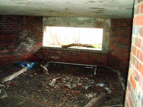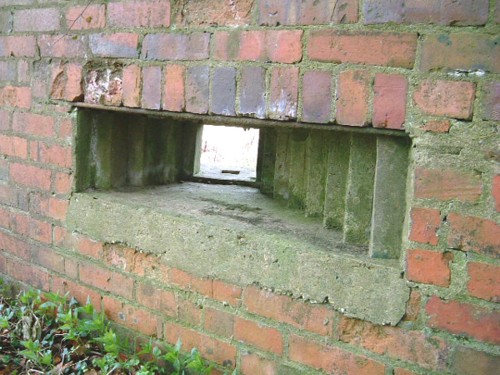 One of the loopholes has an interesting staggered, and stepped casting. All of the walls still have camouflage net retaining hooks. This style of pillbox is one of four that are easily accessible for study in this area.