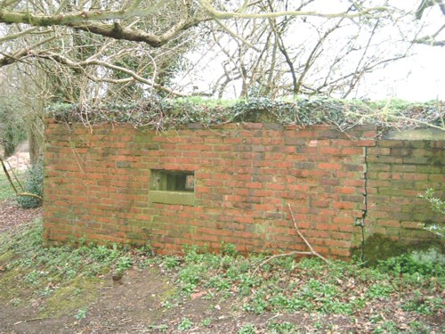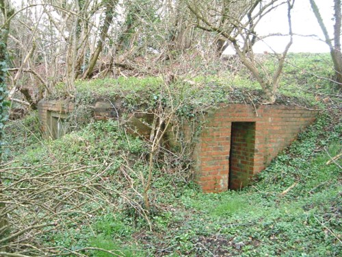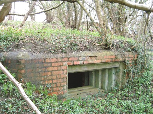 Taking a closer look I was surprised to find that the brickwork was a fully enclosed side entrance to an almost completely dug in Vickers machine gun box. Its cast embrasure facing southeast towards the river. The map reference for its position being SU920440.