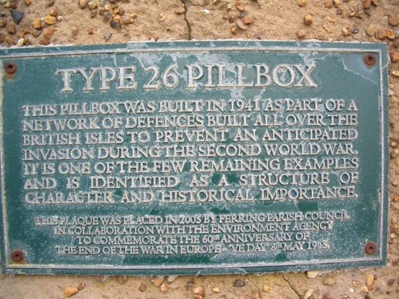 West Sussex Ferring Pillbox by Colin|Updated 27th September 2025 Sea Front Type 26 Ngr TQ 098 015 A restored but completely sealed Type 26 pillbox can be found on the seafront promenade at Ferring, West Sussex. Ferring Type 26 Pillbox Ferring Type 26 Pillbox Ferring Type 26 Pillbox View seawards from the Pillbox By Mark Harley