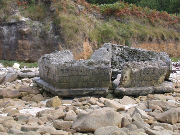 Damaged Type 24 pillbox on beach. I think it has come down from the cliff above. Probably due to erosion. Type 24b looks like an impact hole from a shell in one of the sides.