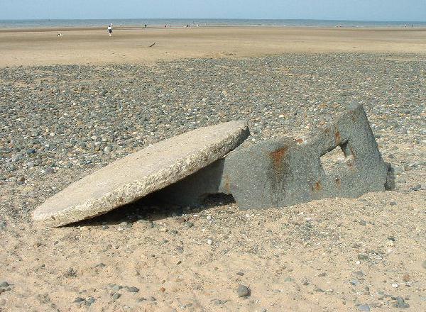 The first pillbox to be seen is the remains of a Type 25 about 200m east of the lighthouse. Originally, it would have been located along the edge of dunes but severe coastal erosion has now moved them back by about 150m, leaving the pillbox exposed to the high tide.