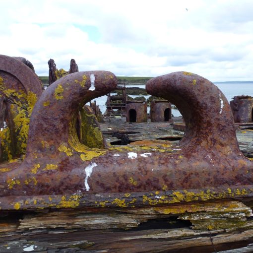 Twin 6pdr QF gun emplacement. A cable railway was laid to facilitate supply of the battery along with a jetty at the camp adjacent to the battery. Fragments of rail remain in-situ and some winding gear too. Some trucks are dumped on the shore below the battery.