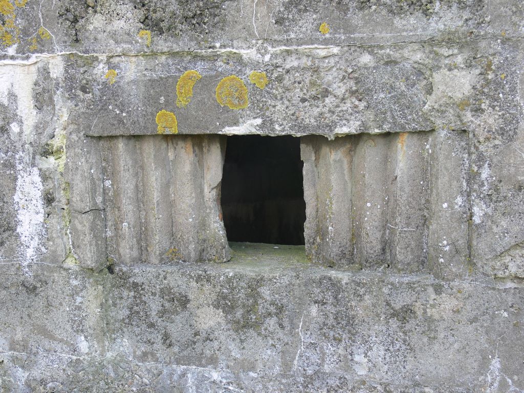 A type 22 pillbox with a (blocked) sunken entrance located at Lyness on Hoy, Orkney. There is evidence that at least one of the loopholes has been modified using stone and concrete.
