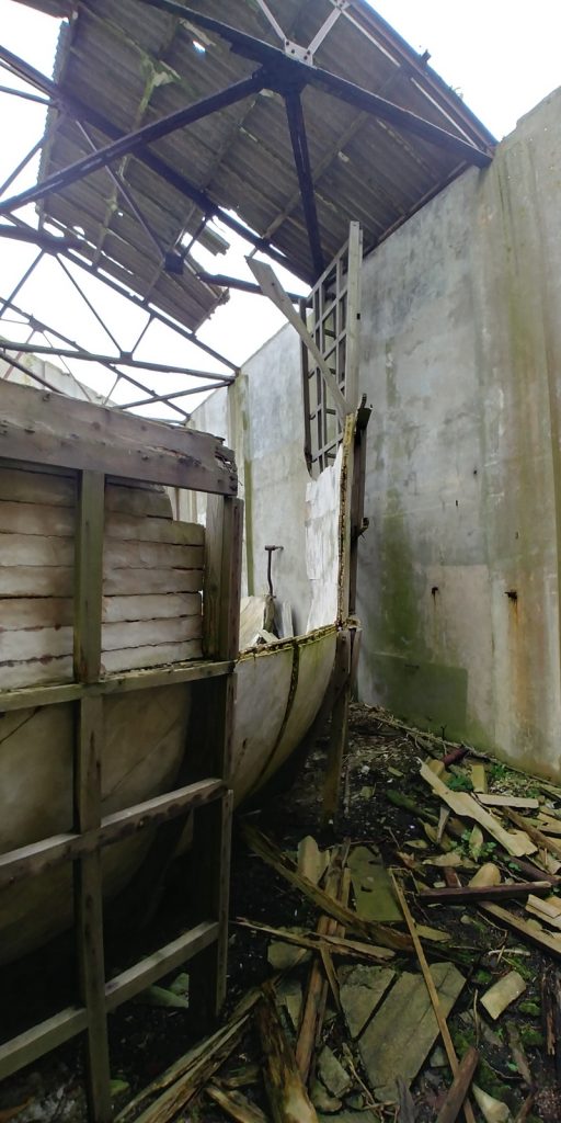 Sadly, this unique Torpedo Attack Trainer, is rapidly being destroyed by Orkney’s harsh weather. Nearly all of the roof is now missing and the remains of the trainer “sphere” are almost gone. These pictures are from 2007.