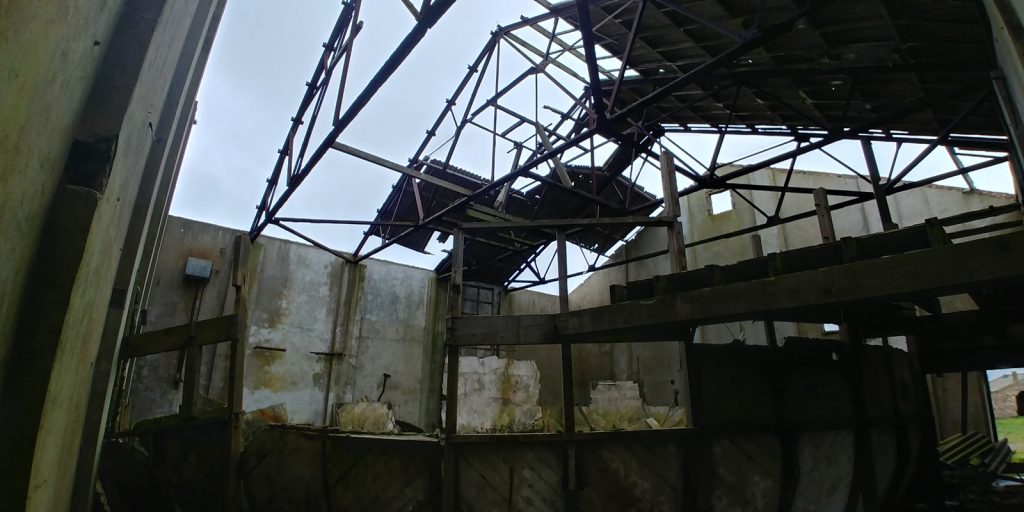 Pictures below from 2022 – roof now completely failed. Drone footage shows large cracks in, now unsupported, gable ends.