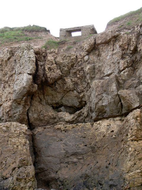 Civil Air raid shelter built into bank. entrance hidden by hedge. emergency exit in concrete slab next to building at far end.
