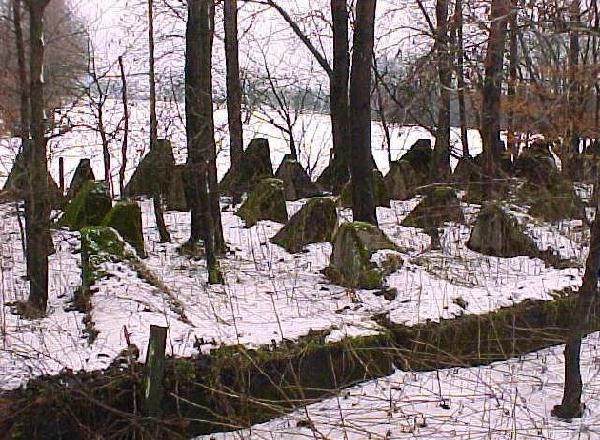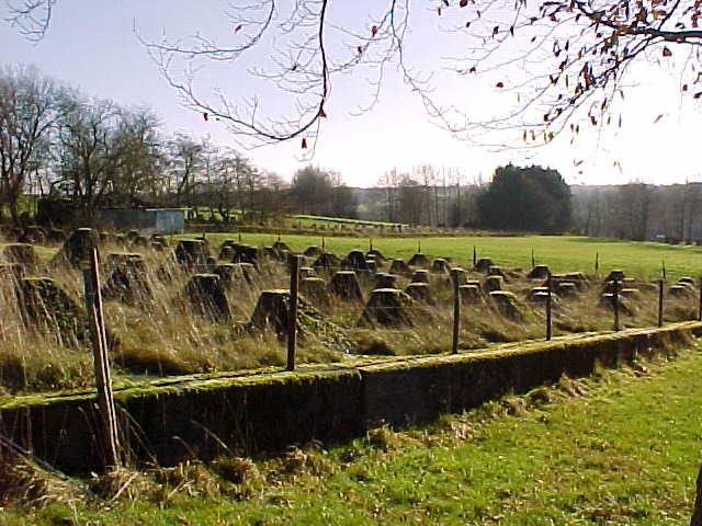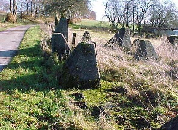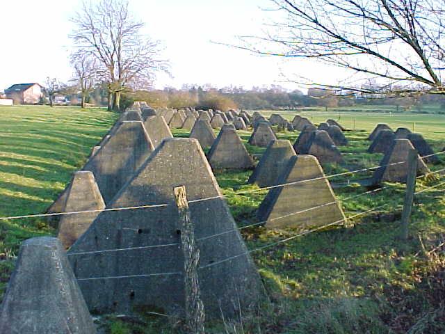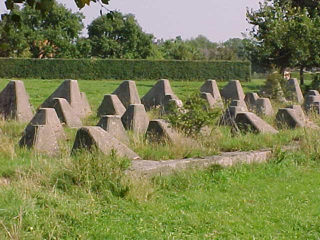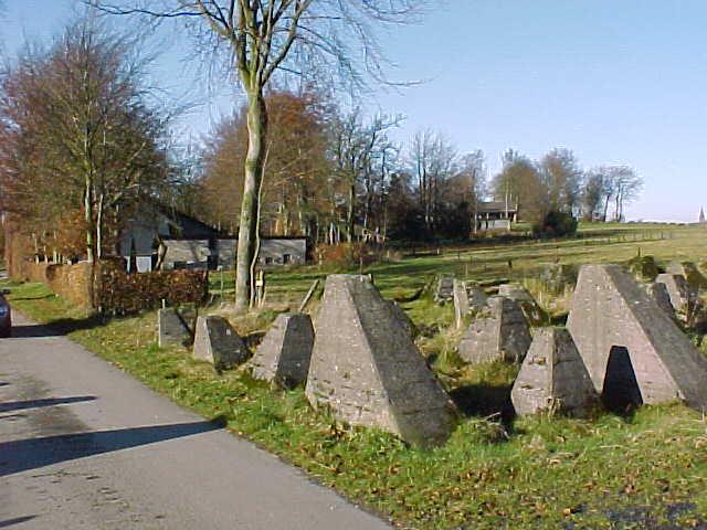 The Wall to the northwest of Simmerath, looking westwards towards Belgium which is about 1.5km away.Standard 5 rows of `pimples` with the largest on the home side.The remains of one of the tank-proof road gates. The girder supports are just visible in front of the left pimple. Such gates were constructed from tubular steel and had vertical hinges allowing them to swing across the road. Very few gates remain.The front of the massive 1m x 1m longitudinal buried concrete bearer running along the line into which the forward pimples were cast. The posts supported barbed wire. Behind this bearer are two similar parallel longitudinal bearers about 5 to 6m apart. These are now almost covered with soil. The sharp angles in the Wall here may have allowed enfilade fire from dug-in anti-tank weapons along the front of the line.Another section of the Wall between Aachen and Roetgen. Pimples within the obstacle were cast on transverse bearers, which were constructed between the 3 longitudinal bearers to form a massive supporting concrete grid. Some of these transverse bearers are visible in the forground.This photograph illustrates how the pimples were set in irregular patterns to maximise the effect of the obstruction.This picture shows the forward edge bearer on the same site.Located between Simmerath and Imegbroich, this site shows how the largest home side `pimples` (some 2m high) were staggered along the longitudinal rear bearer. Additional smaller pimples were set in the gaps.his picture shows the adjacent section under snow. The skewed shapes of the pimples, which further enhances the obstacle, can be seen on the left.This illustrates the Wall spanning a small stream. This view, looking from the West, also shows how the Wall has become totally overgrown with trees in many places. Nevertheless, the forward edge is still clear and is now a footpath. by