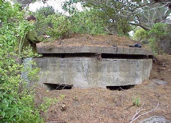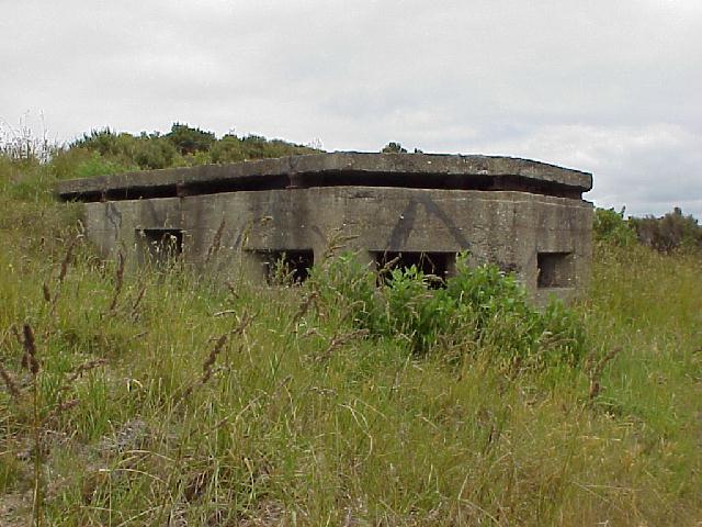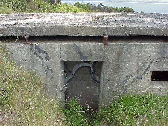 The approaches to the battery are defended by 11 pillboxes which generally conform to a standard design for the NZ Northern Defence Region C/-1942. These are reinforced concrete emplacements (concrete is 12″ thick) for LMG’s, 13’6″ x 11’6″ x 9′, rear 2/3rds being rectangular and the front third being hexagonal with 3-5 embrasures (5 being uncommon). The embrasures are 12″ x 24″ x 12″, widening to 30″ in the front from the 8″ mark. The roofs were reinforced by an extra six-inches of concrete sitting atop iron supports. Entry was by a door in right-hand wall, rear third.