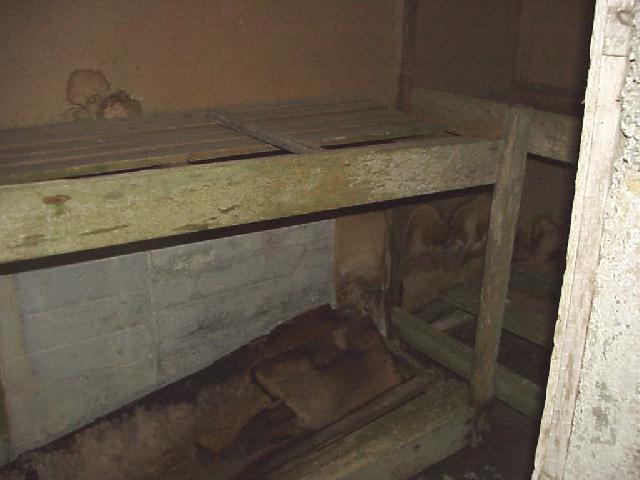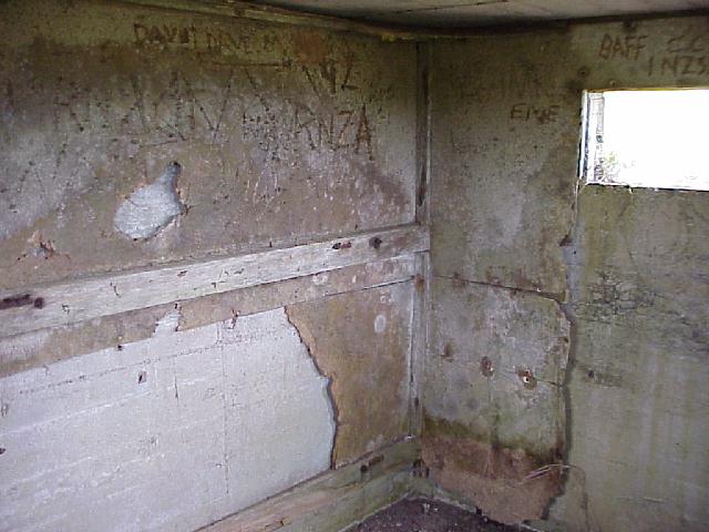 The guns themselves sat on wooden tables and wooden bunks covered the rear wall (the interior walls were covered in “pinex” chipboard) – two of the pillboxes (“kilo” and “lupo”) are atypical in having separate bunk-room in the rear, and Lupo is the only one with 5 embrasures. The pillboxes were built on/into slopes (probably by cut-and-fill).