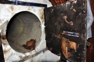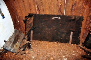 Some parts of the wooden remnants could be identified, though all are in a poor state [figures 7 and 8]. Most of the wood seemed to have been painted blue at some time. Three doors remain as well as a small door which would have blocked off one of the ventilation ducts. These all seem to have had bolts on both sides. The doors were covered with a type of oiled felt. The remnants of what might have been one of the shaft hatch covers were also found.