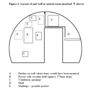 The entrance shafts and the room dividing walls were constructed from concrete blocks, most of which had been plastered and painted white. All the walls showed signs of where items such as shelving had been secured. The doorways all had spaces where wooden lintels would have been but these are either missing or in a very rotten condition.