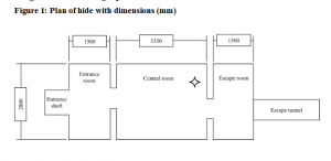 The hide is located within a circular earthwork in Heifer Law wood, to the north of Alnwick [map reference NU180177]. It consists of an underground building with three rooms [figure 1]. At one end there is a vertical access shaft [figure 3]. At the opposite end there is a 14 metre escape tunnel which exits into another vertical shaft [figure 4].